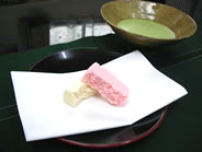 | 今回初めて私も頂いたのですが、手でちぎってみるともっちりしていて、食べてみるとぷつぷつした食感の中に、すーっとした甘さが口に広がり、お抹茶によく合う美味しいお菓子でした。