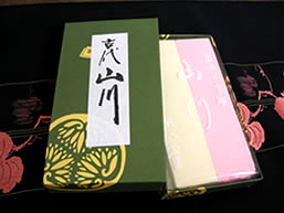 「 散るは浮き 散らぬは沈む 紅葉ばの 影は 高尾の 山川の水」 この歌から作られたお菓子(落雁)です。 赤はもみじ葉を、白は山川の水を表します。