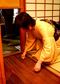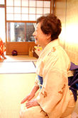 「にじり口」から茶室に入り、お軸・茶花の拝見、歩き方・礼の仕方をひと通り訓えて頂きました。