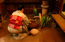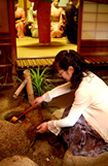 お茶室に入る前に、まずは「蹲踞(つくばい)」で手と口を清めます。 飛び石からはみ出ないように歩くのがポイント! これが結構難しいのです。ハイ。・・・お茶室は神聖な場所ということなのかな?お寺や神社にも同じのがありますよね。