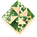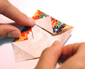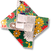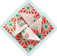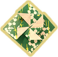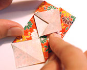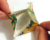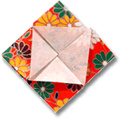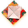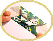 箱折りのところで、 斜めにおり返して表の柄を出します。