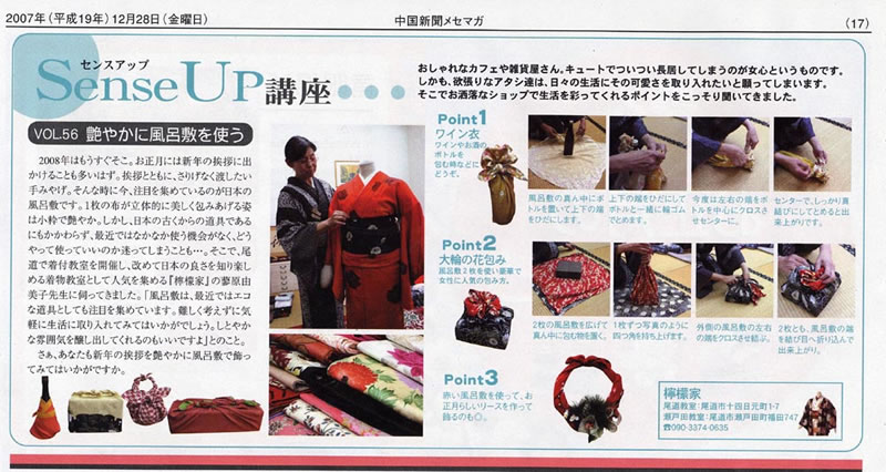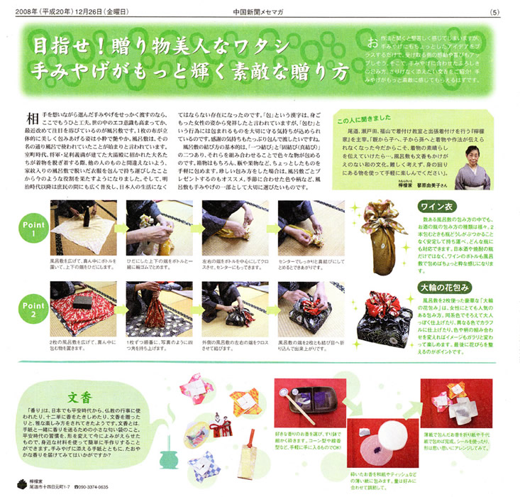 12月26日金曜日の中国新聞メセマガに、風呂敷の包み方と文香の作り方が紹介されました。表紙写真にも掲載していただきました。