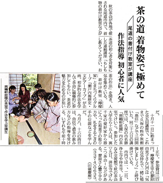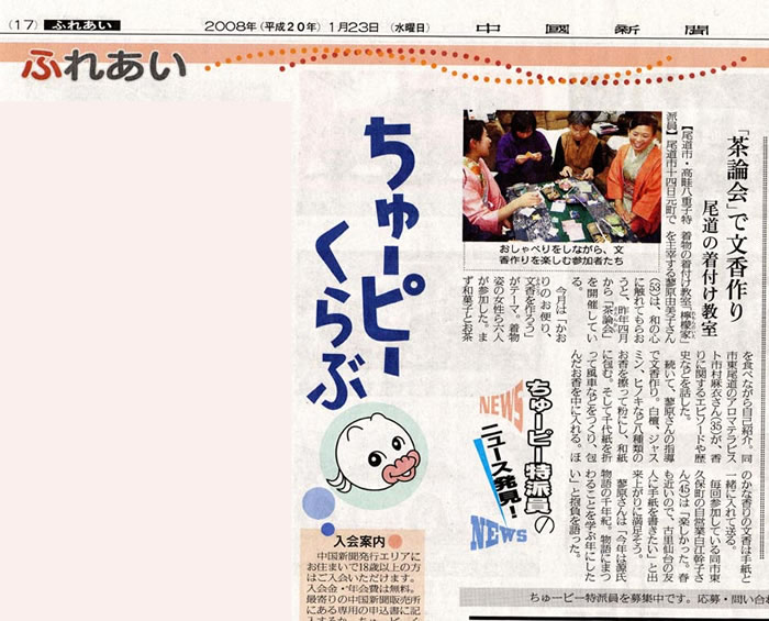 平成20年11月1日発行の中国新聞の地域欄に「檸檬家(れもんのいえ)」と、まちづくりグループ「瀬戸内海歴史・文化アーカイブ」が企画した茶論会「もしもし教えてください、お茶の作法」をご紹介頂きました。