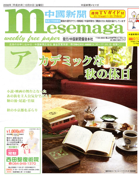 平成20年10月31日発行の中国新聞mesemaga(メセマガ)の表紙に使われている喫茶店の写真。そこに可愛らしく装丁された復刻本が数冊おいてあります。